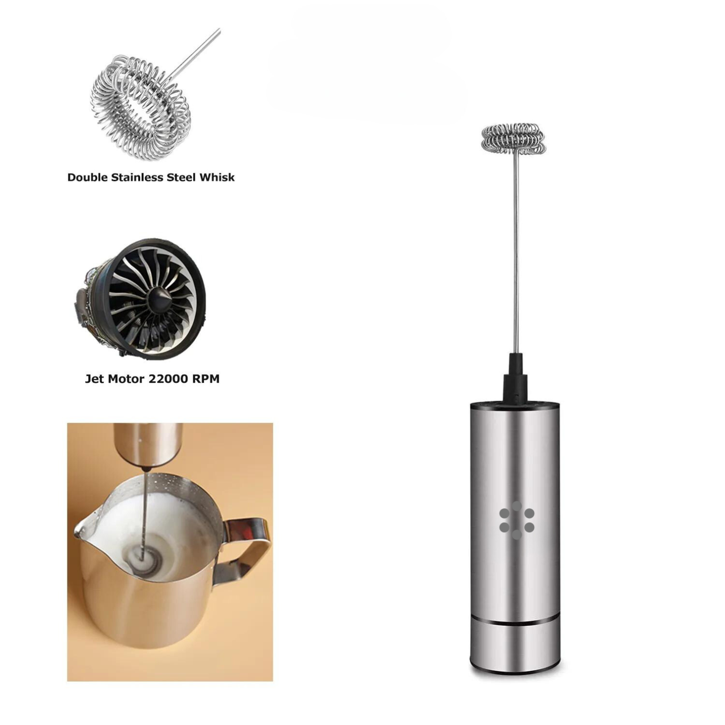 Brand of High-Quality Products, introduce the New Jet Power Stainless steel Milk Frother, its Powerfull motor would foam the milk in seconds, mix drinks, and be used as a powerful mixer/ Milkshake maker, small and portable you can take with you anywhere you go.